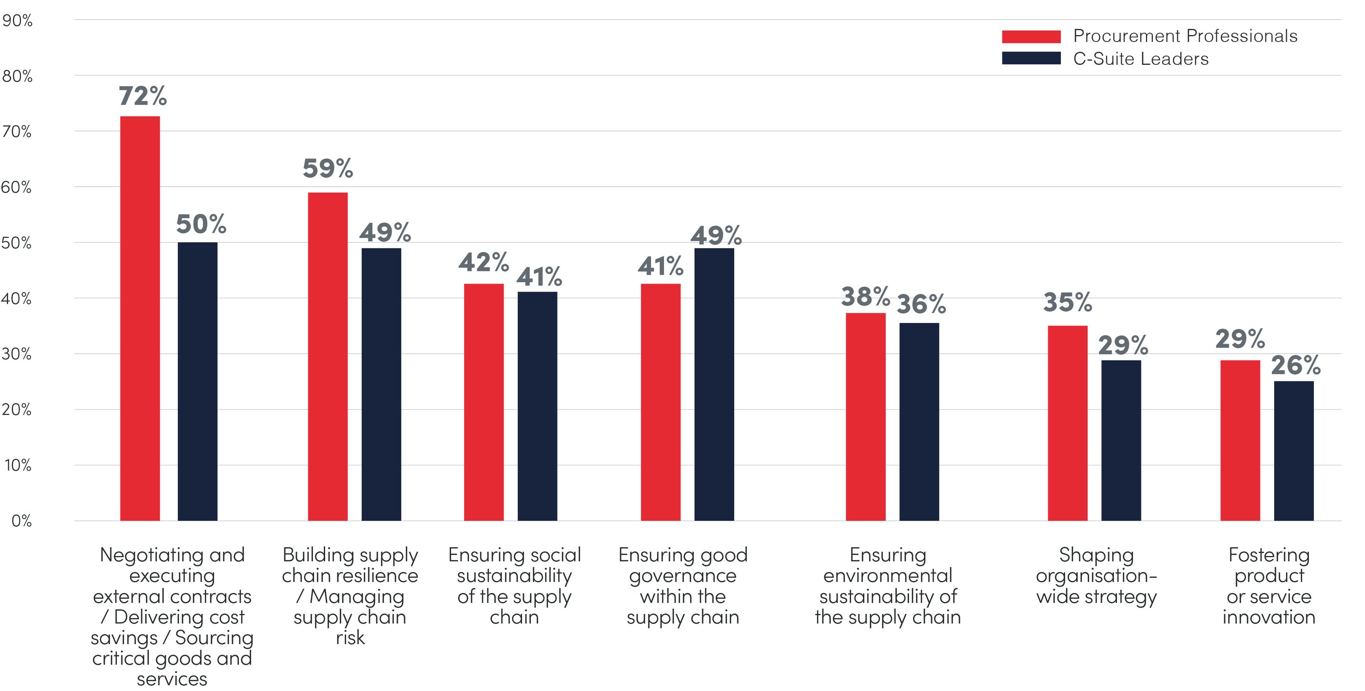 However, if you speak to procurement professionals, the large majority will still say the overwhelming topic of interest for procurement is cost. Indeed, our own research found that procurement professionals see “delivering cost savings / sourcing critical goods and services” as the primary role of the procurement, with a gap compared to the C-suite's perceptions (noticeably lower, with a disproportionately higher belief in other roles falling within the remit of procurement, compared to procurement professionals).