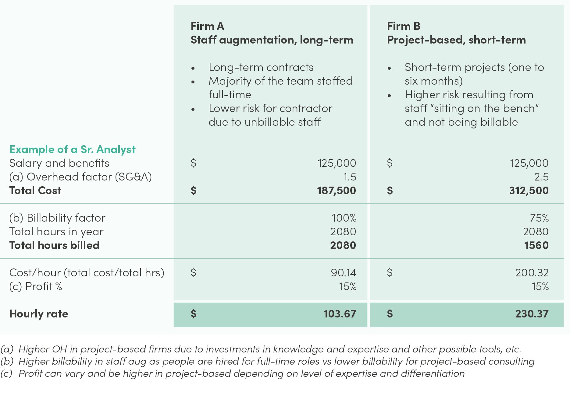 The primary issue lies in how project-based services are negotiated versus “staff augmentation” contracts, where contracted service professionals are effectively working full time for the government. As shown below, a Senior Analyst with the same salary and benefits could have two very different hourly rates depending on the business model and underlying cost structure.