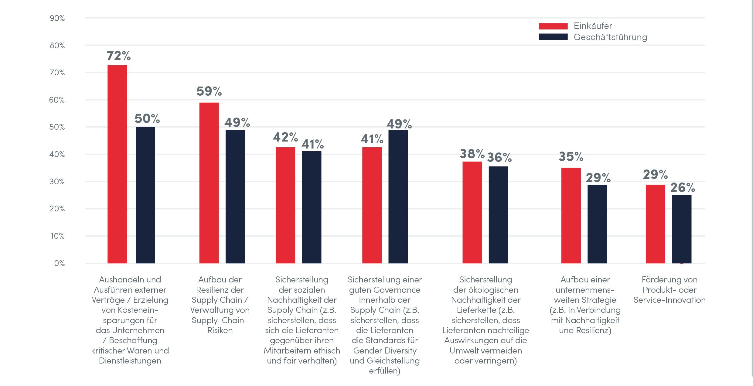 Wenn Sie jedoch mit Einkaufsexperten sprechen, wird die große Mehrheit sagen, dass die Kosten nach wie vor das wichtigste Thema für den Einkauf sind. Unsere eigenen Untersuchungen haben ergeben, dass Einkaufsfachleute „das Erzielen von Kosteneinsparungen bzw. die Beschaffung kritischer Güter und Dienstleistungen“ als Hauptaufgabe des Einkaufs ansehen, wobei hier eine Diskrepanz zu den Wahrnehmungen der Unternehmensleitung besteht, welche dies zu einem deutlich geringeren Anteil als zentrale Aufgabe des Einkaufs betrachtet.