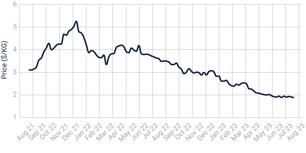 Fig. 2: “Baltic Exchange Air Freight (BAI) Index ($ / kg)” (August 2021 to August 2023), Refinitiv Eikon2