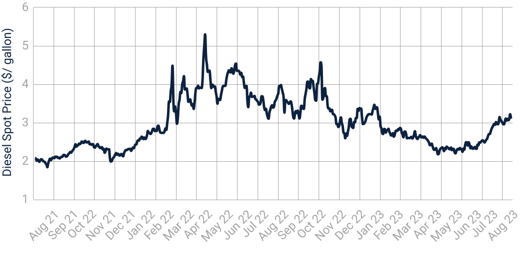 Fig. 4: “United States Gulf Coast Ultra-Low Sulphur Number 2 Diesel Spot Price ($ / gallon)” (August 2021 to August 2023), Refinitiv Eikon