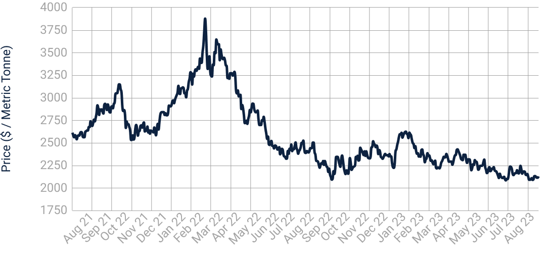 Fig. 2: “London Metal Exchange (LME)-Aluminum 99.7% Cash ($ / Metric Tonne)” (August 2021 to August 2023), Refinitiv Eikon