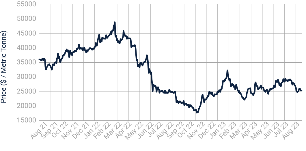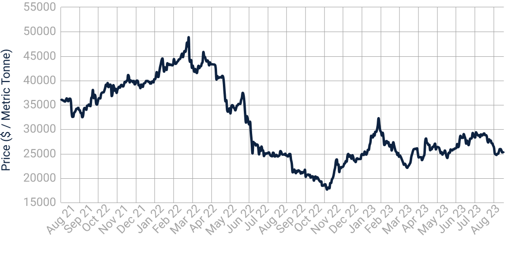 Fig. 5: “London Metal Exchange (LME) – Tin 99.85% Cash ($ / Metric Tonne)” (August 2021 to August 2023), Refinitiv Eikon