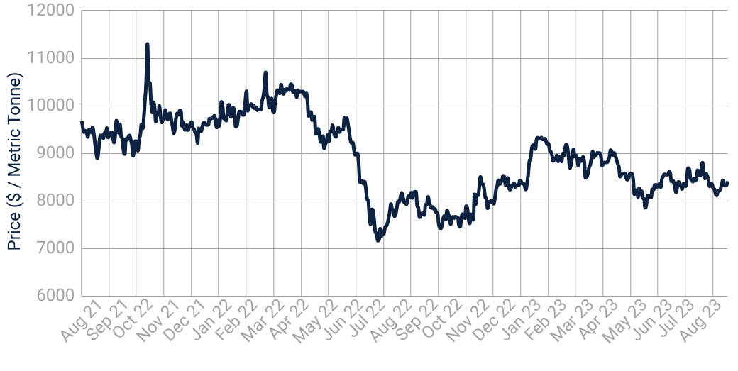 Fig. 3: “London Metal Exchange (LME) - Copper Grade A Cash ($ / Metric Tonne)” (August 2021 to August 2023), Refinitiv Eikon