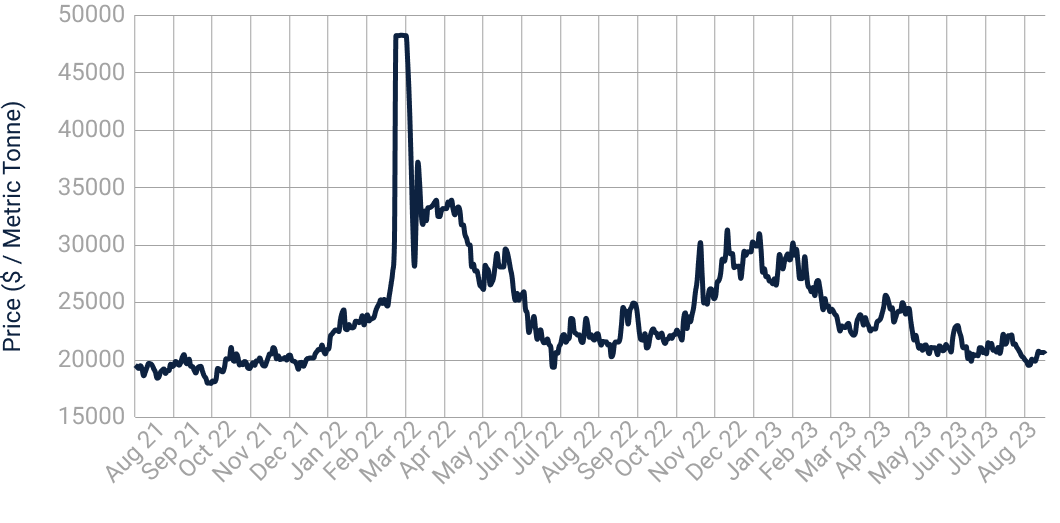 Fig. 4: “London Metal Exchange (LME) – Nickel Cash ($ / Metric Tonne)” (August 2021 to August 2023), Refinitiv Eikon
