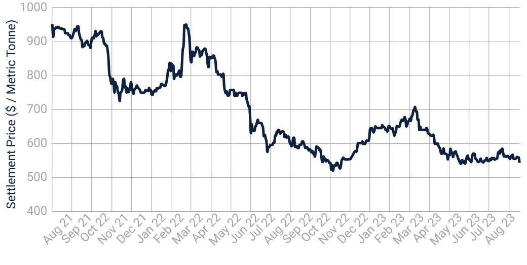 Fig. 1: “LME-Steel HRC FOB CN Argus Continuous, Settlement Price ($ / Metric Tonne)” (August 2021 to August 2023), Refinitiv Eikon