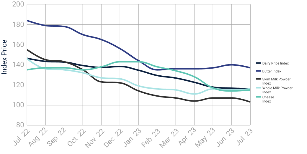 Fig. 3: “UN FAO (Food and Agriculture Organization of the United Nations) Dairy Indices” (July 2022 to July 2023), UN FAO