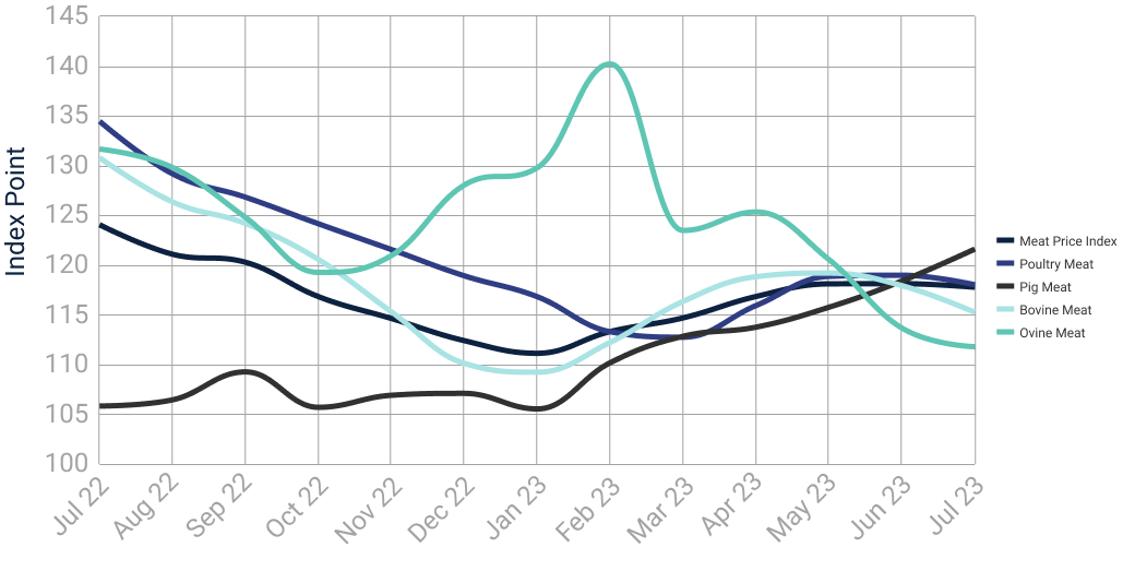Global meat prices decreased in H1 2023 as a result of subdued global demand. The FAO Meat Price Index averaged 117.9 points in May, an 8.1 point decline from its all-time high in June 2022.