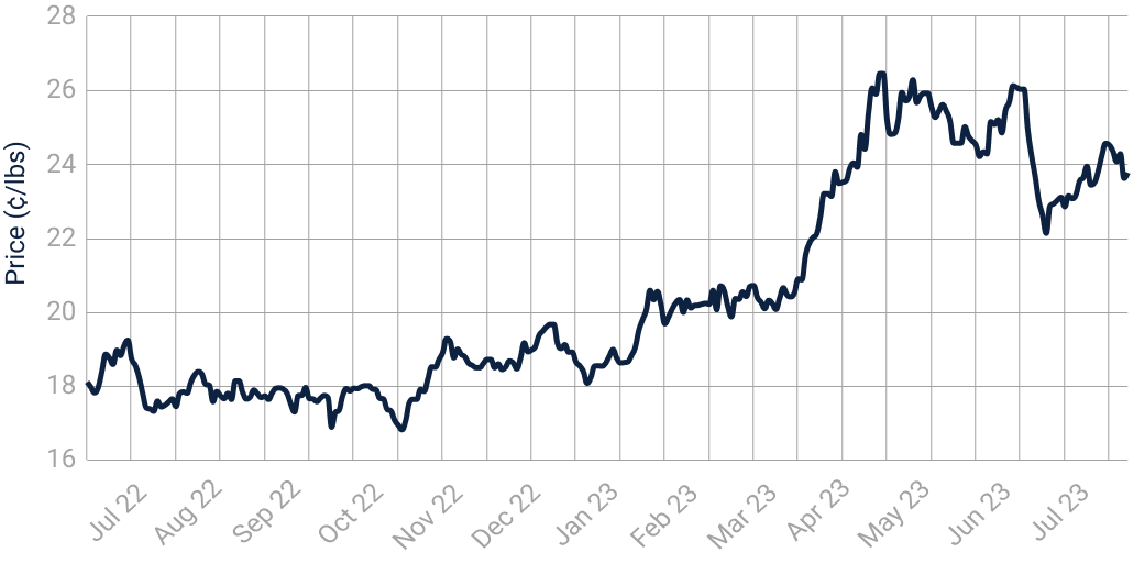 Fig. 4: “Raw Sugar-International Sugar Agreement (ISA) Daily Price (¢/lbs)” (July 2022 to July 2023), Refinitiv Eikon